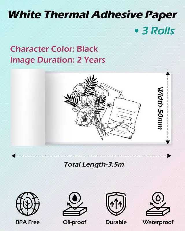 High Resolution With 300dpi- Adopt with inkless printing technology, clear printing effect when fully charged. No ink or carbon tape is needed, and the printing paper will not turn black. This mini printer is equipped with a roll of white 110mm wide thermal paper.