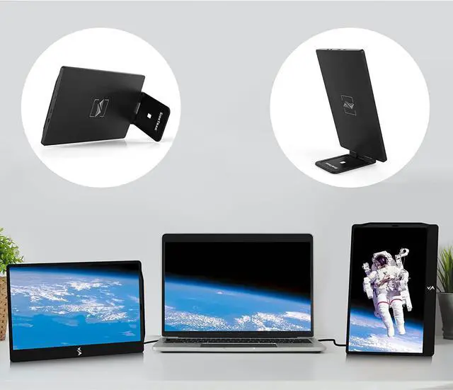 All other port types may require a two-cords connection, USB-A & HDMI. Its compact, innovative attachment is designed to fit any laptop size and its built-in kickstand allows it to transition to a freestanding monitor. Adjust SideTrak Swivel to your viewing preferences by rotating the screen, adjusting the brightness, or using the kickstand.