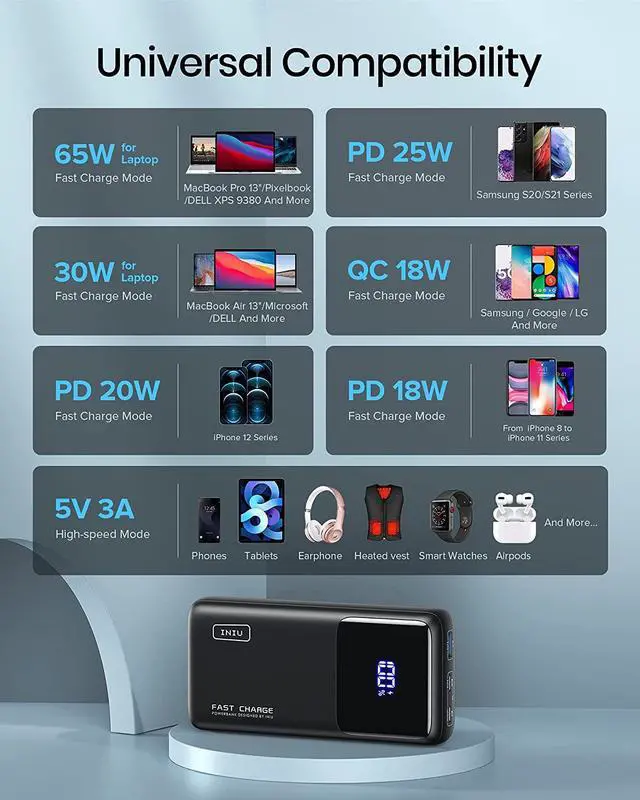 Unlike the markets most chargers unable to charge small devices like your AirPods, smart watch/band, Bluetooth earphone/speaker, etc, INIU the Ultimate fits every device, no matter the size. Even more conveniently, you dont bother to activate a trickle charge mode for them, just insert and go.