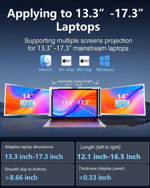 Compatibility: Our laptop monitor extender are suitable for 13.3" - 17.3" laptops. Please ensure that your laptop's screen length, height, and thickness fall within the following ranges to ensure a proper fit for our laptop screen extender. (Note: 13.3 "- 17.3" refers to the diagonal size of the laptop screen).