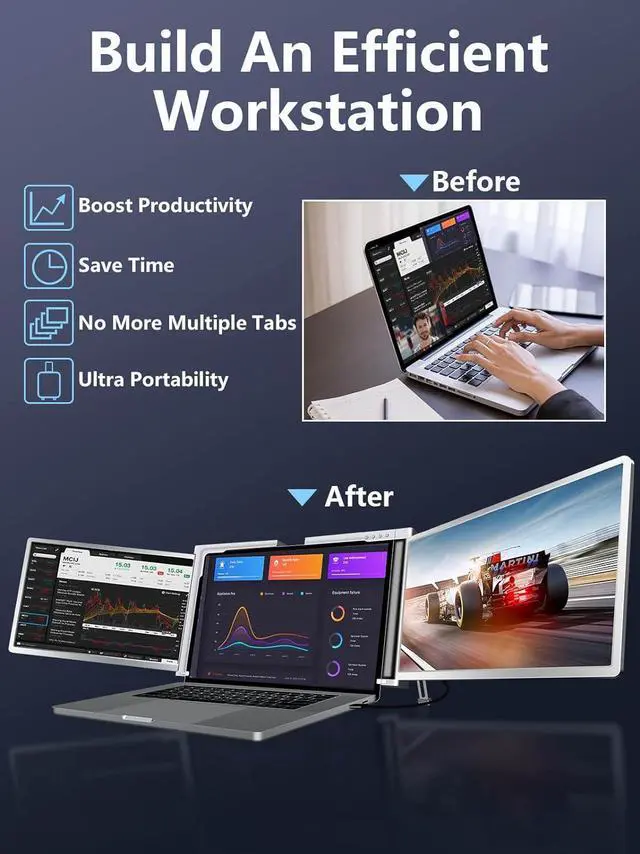 Escape the limitations of a single screen that demands constant page switching. Embrace the power of portable monitor for laptop, enabling seamless multitasking and enhanced productivity. Create your own personal mobile workstation, catering to the needs of designers, programmers, stock speculators, and gamers alike. Experience a remarkable boost in efficiency that empowers you to accomplish more, with the flexibility and versatility of dual monitors by your side.