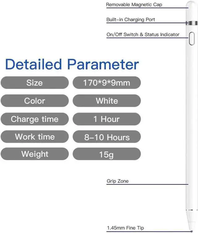 Charging condition: 5V- 0.2A. It will cut off power automaticly after a full charge. Stand-Alone active stylus design. NO Bluetooth or APP required. Compatibility --- Works with all capacitive touch screen, For PC, Universal, compatible with most touch screen devices, compatible with iPhone, iPad, iPad Pro, iPad mini, ipad air, Compatible with all Samsung tablets all Samsung tablets and for Android smart phones, HTC, Samsung Galaxy, Huawei Lenovo LG Nokia iOS and Android Capacitive Touchscreen. The best stylus Pencil for artist, journalist, teacher and students etc. Precise/ Sensitivity --- It has a 1.45 mm super fine tip gives you the accuracy you need and provides superior control and traction against tablet screens. It is made of copper that will last for a lifetime. Active stylus technology reduces off set and lag time between fine tip and trace, keep your tablet or phone screen free of finger smudges by using this stylus instead. 2-in-1 design --- 2019 newest 2 in 1 styluses latest AICase Active stylus pen 1.45 mm fine elastic tip and sensitive technology offers the better accuracy, which gives you a comfortable experience when taking notes, drawing, writing, signing on any smart phones and tablets.