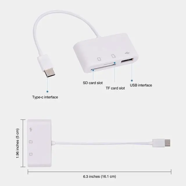 3 IN 1 Card Reader - This card reader come with SD/Micro SD dual card slot and USB slot It could easily transfer the file you need between different devices or review the photos/videos quick. On-The-Go Date - Support on all OTG device. Play back videos/music directly from external memory without occupying space on Device. Share video or picture to your families or friends in anytime anywhere. Please contact us if you don't know whether your phone have OTG function we will help you. Universal Compatibility- Suitable for Android phone/pads with OTG function Computer and laptop or any devices with USB-C port this card reader max support memory card capacity 512GB.