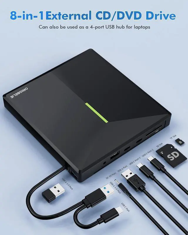 Note: SD and TF slots are not available for use at the same time. 2 in 1 USB 3.0 Data CableThe built-in USB 3.0 Type-A/C data cable ( on the back of the device) support adapter-free connection to laptops/PCs. Also equipped with power supply cable because some computer doesn't have enough power to support the operate of the USB DVD drive external. Then you can use this cable to connect to 5V charger or power bank to get extra power. Compact & PortableThis ultra-slim external dvd drive for PC boasts a sleek stylish design. Integrated data cable design no need to worry about cable missing. Matching storage bag for easy carry. Great for home office and travel. (If need an extra carrying case search B0CL37QV7P on! ) Also equipped with the latest RGB LED indicator which cycles through gradual color changes elevating the ordinary DVD burner into cool and fashionable. What You GetYou will get 1 x External Optical Drives 1 x USB A to DC Power Supply Cable 1 x Storage Bag 1 x User Manual. We also offer 90-Day warranty and support with any technical issues or questions you may encounter during use.
