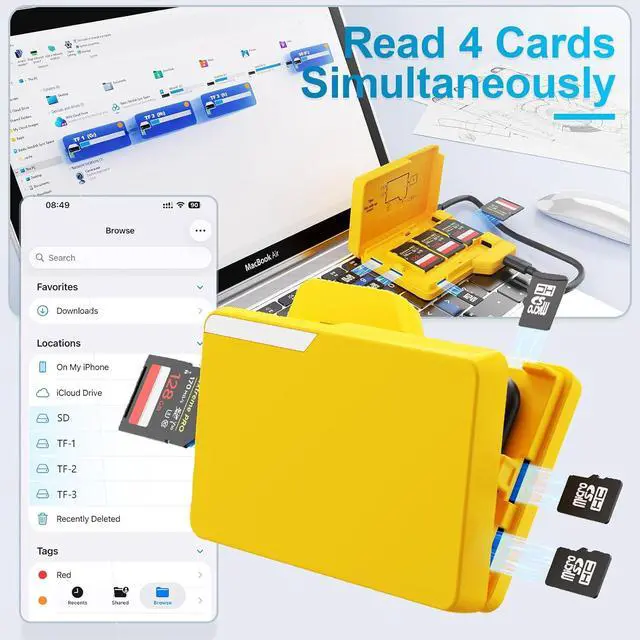 Its compact yet efficient design ensures seamless access and organization of your digital content making it an ideal companion for those who require quick swaps and secure storage of their SD cards. Plug and PlayThis card reader is specifically designed for SD&TF cards featuring high-speed transfer and wide compatibility. It supports memory cards up to a maximum capacity of 1TB enabling seamless real-time sharing and data transfer across your devices. This card reader is lightweight and compact making it ideal for taking outdoors plug and play without occupying much space. With Desktop Folder AppearanceThis card reader boasts a Desktop Folder design that is both compact and elegant allowing you to instantly recognize and retrieve it from your cluttered bag saving you both time and energy.