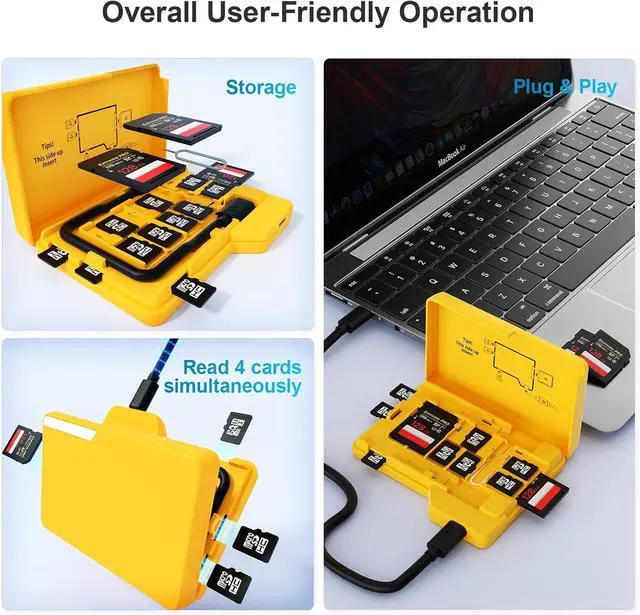SD &Micro SD Card ReaderThe SD Card Reader offers seamless data transfer enabling users to effortlessly share their cherished pictures invigorating music and captivating videos across various devices. Its versatility lies in the compatibility with a broad range of SD memory card capacities supporting SD 3.0 cards with a maximum storage limit of an astonishing 1TB. This ensures ample space for storing your digital memories ensuring seamless access and sharing across multiple platforms. Small Case Large CapacityThe SD Card Reader designed for ultimate convenience boasts a spacious capacity to hold up to 4 SD Cards & 11 TF cards simultaneously.