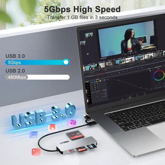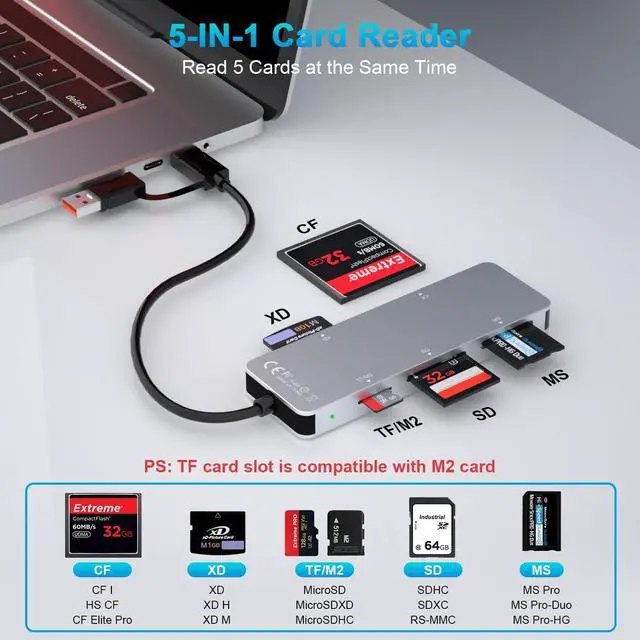5-in-1 Multi-Card ReaderThis versatile?? USB 3.0 SD card reader?? supports Memory Stick Pro Duo/?? XD Picture Cards/ SD/ TF/ CF cards??. Transfer files between 5 cards simultaneously for maximum efficiency. (M2 and TF use the same card slot). Blazing Fast 5Gbps TransfersExperience professional-grade speeds with this?? USB 3.0 card reader?? transferring RAW photos and 4K video up to 10x faster than USB 2.0. The?? Memory Stick Pro Duo adapter compatibility with S-ony memory cards the?? SD card reader?? works with standard SD cards from DSLRs and other devices.
