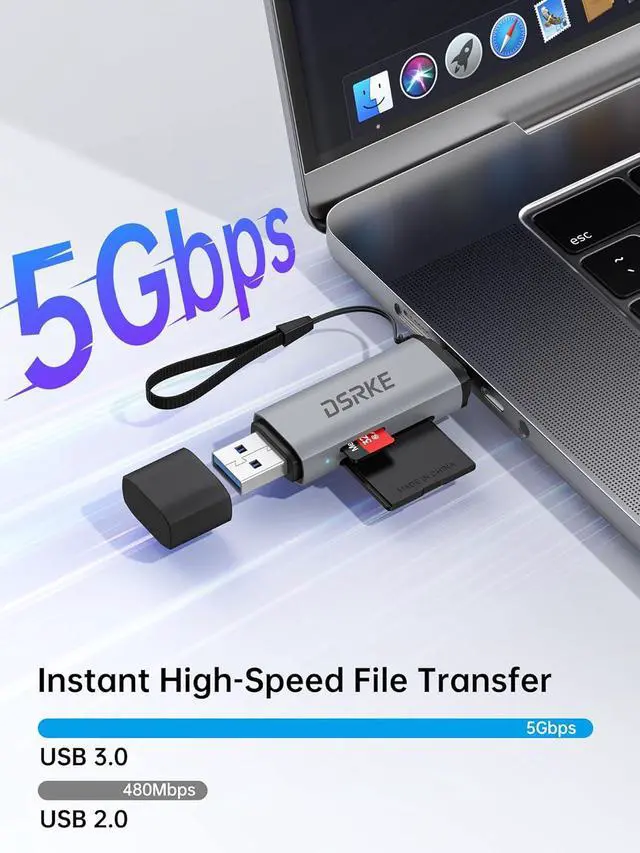 Design: The DSRKE SD card reader features dual USB-A and USB-C ports both supporting high-speed data transfer up to 5 Gbps - a 1GB file transfers in seconds. It is compatible with SDXC SDHC SD MMC RS-MMC microSDXC microSDHC and microSD (TF) cards and is also backward compatible with USB 2.0 / 1.1. Whether you use older USB-A devices or newer USB-C devices it adapts flexibly to your connectivity needsSimultaneous