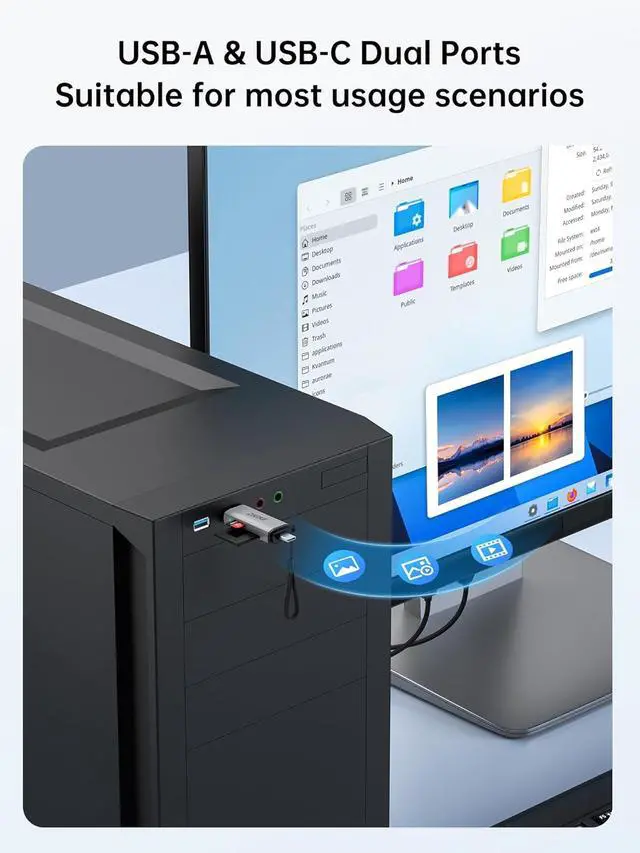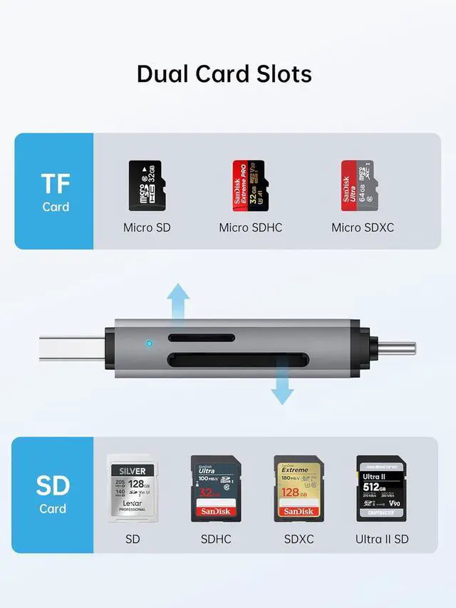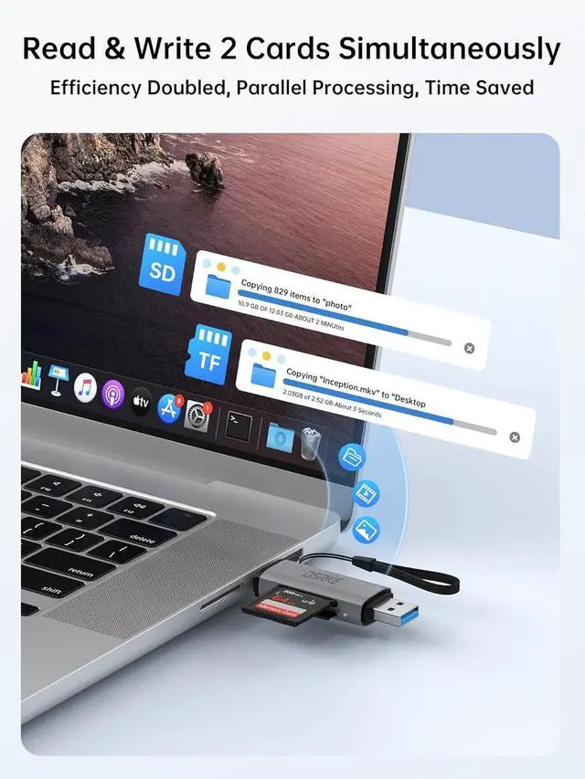 Reading & Writing: Dual card slots for doubled efficiency - With two separate slots for SD and microSD (TF) cards you can read and write to both card types simultaneously- no more constant plugging and unplugging. Whether you need to quickly download photos from your camera transfer surveillance videos from your dash cam or sync files between two memory cards this parallel operation saves you valuable time and sustainably boosts your productivityPlug