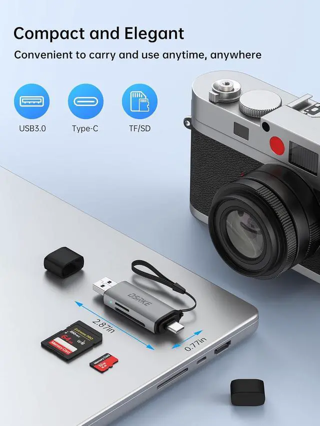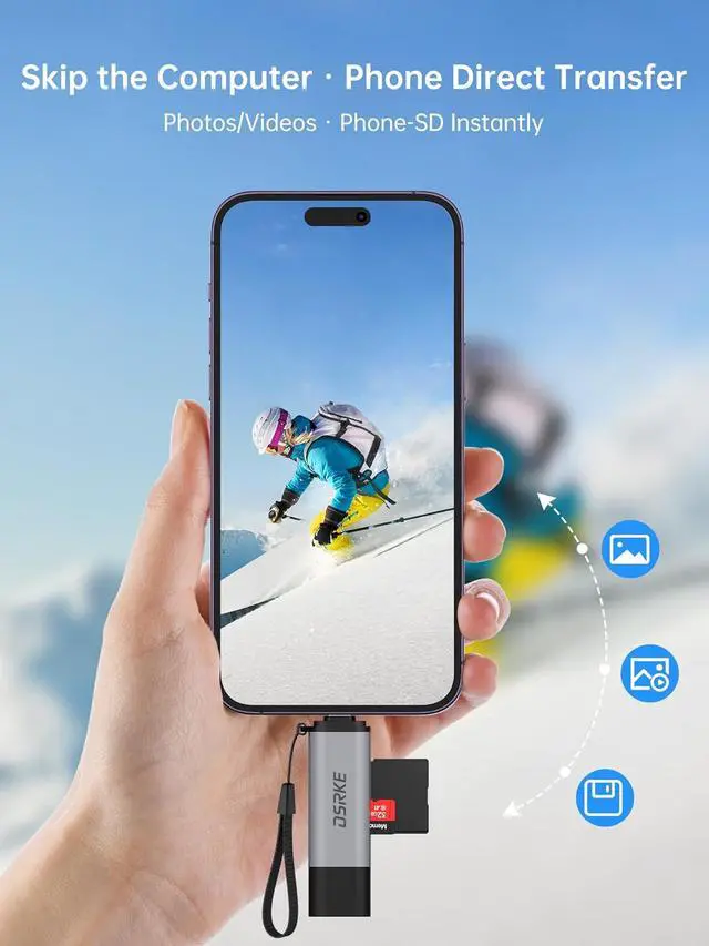 Transfer: Direct no software needed - Connect the DSRKE reader directly to memory cards from cameras GoPros dash cams or surveillance cameras - no extra apps or Wi-Fi required. You can instantly view photos/videos and manage files on your smartphone or computer. After outdoor shoots export footage in a flash and share exciting moments in real time - making creative shooting and documenting even smoother