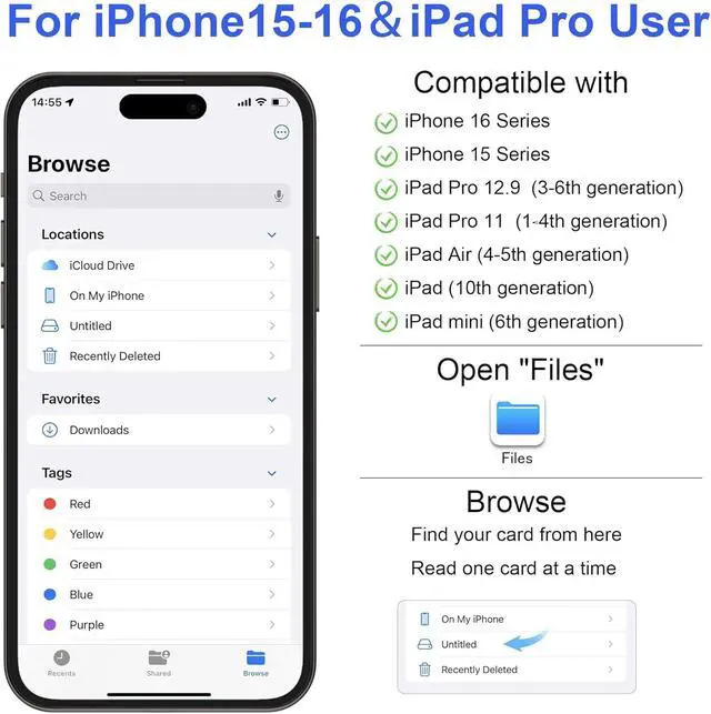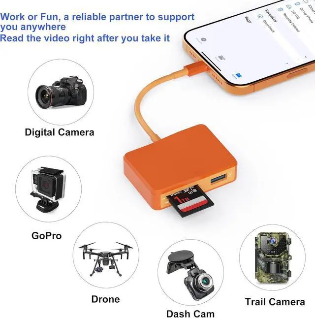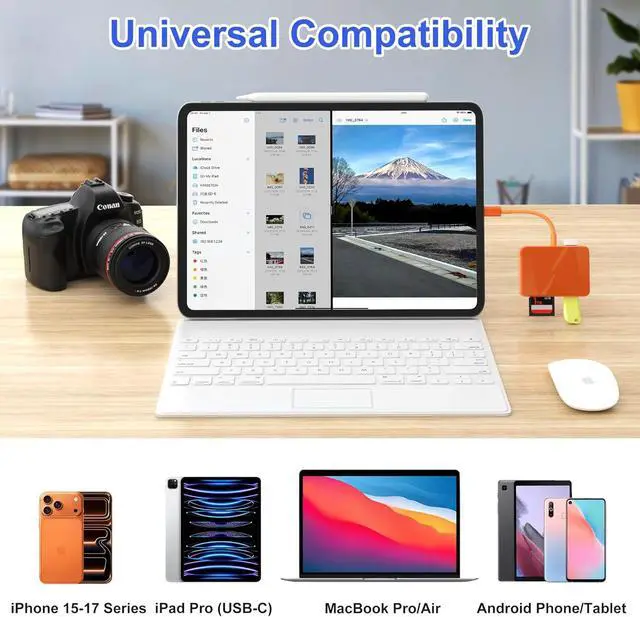[Wide Compatibility]: This USB-C SD card reader is compatible with iPhone 17 iPhone 17 Pro iPhone 17 Pro Max iPhone 16 iPhone 16 Pro iPhone 16 Pro Max iPhone 15 iPhone 15 Plus iPhone 15 Pro iPhone 15 Pro Max MacBook Pro 2025 M5/2024 M4 2023/2022/2021 MacBook 2017/2016/2015 iPad Pro 2021 M1/2020/2018 Surface Book 2 Galaxy S22/S21/S20/S10/S9/S8/Note 10/Note 8/Note 9 Pixelbook XPS 15 / XPS 13 Galaxy Tab S8/S7 and more type c devices.