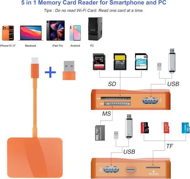 [Dual Connectors Design]: This product compatible with USB-C and USB ports (includes a detachable USB-C to USB adapter). Simply plug the USB-C connector into devices like iPhone 17/16/15 Pro Max iPad Pro Mac Android phones or PCs or attach the USB adapter for older computer devices. This versatile setup enables seamless cross-platform data transfers move photos videos and files between iOS Android Windows and macOS systems with full OTG support. [SD/MicroSD/MS Triple Card Slots] This card reader usb c gives you the flexibility and convenience of accessing multiple types of memory card. With support for reading and writing large capacity up to 2TB you can easily review files or back up and archive photos and videos compatible with SD SDHC SDXC Micro SD TF Card Micro SDHC Micro SDXC UHS-I UHS-II Camera Card and so on. [Accessories for Macbook with Dual USB Female Port] This converter not only has a Triple card slots but also Dual USB interface which can read and write from one card and dual usb ports at the same time. It is a good partner for MacBook and iPad Pro. This USB C to USB Adapter Compatible with USB devices like Digital camera/SLR/USB Flash drive/Keyboard/Mouse and so on The USB Adapter built-in newest powerful USB chip not only can quickly and smoothly speed up the transfer but also can ensure transfer safety.