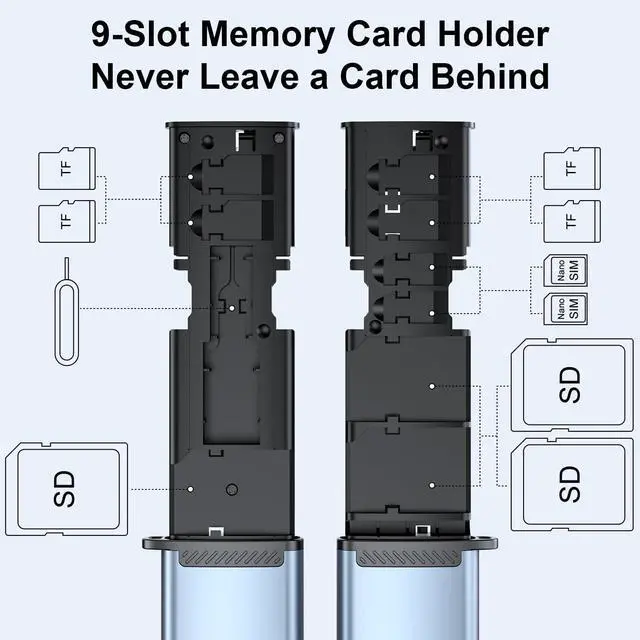 Combines an SD card holder and high-speed card reader; accommodates 2 Nano SIM cards 3 SD cards and 4 TF cards with simultaneous reading of 3 memory devicesHigh-Speed