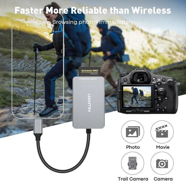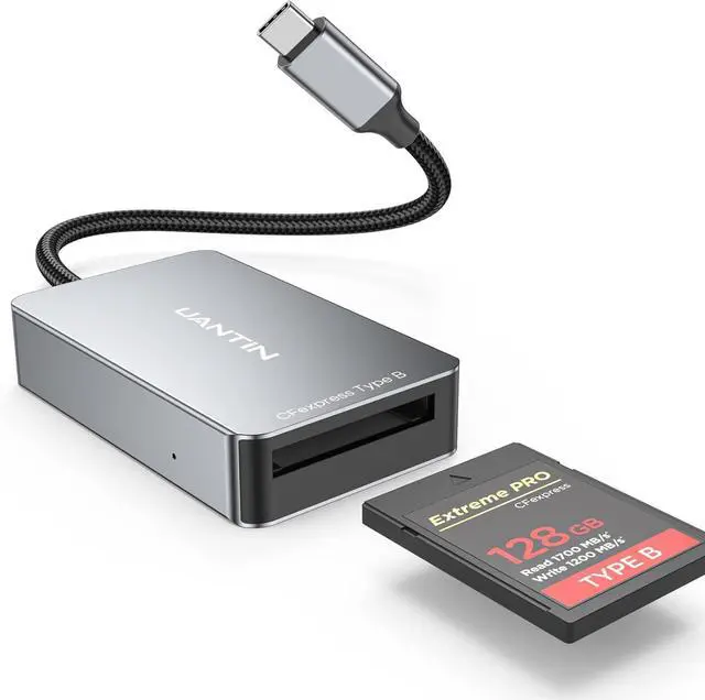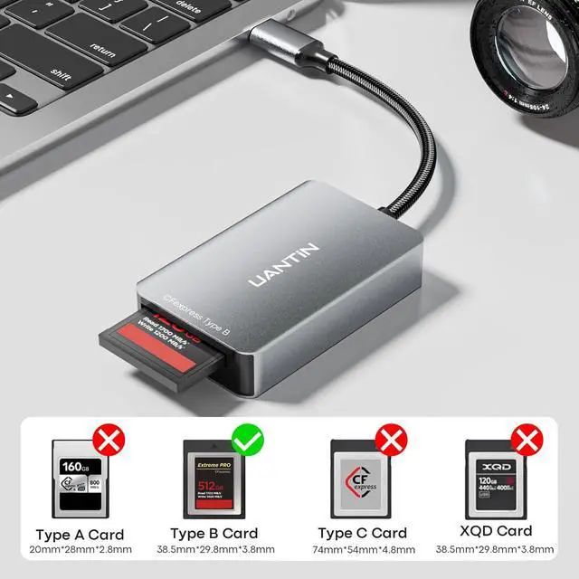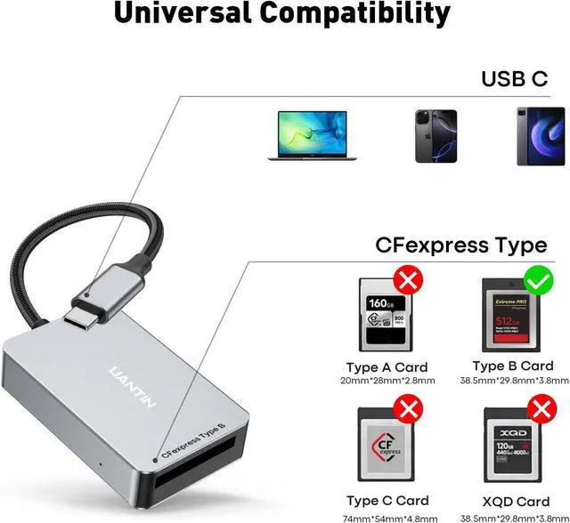 ? High-Speed Data TransferUANTIN CFexpress card reader supports USB 3.2 Gen 2 (10Gbps) transfer protocol delivering read/write speeds up to 350-450Mb/s. It enables rapid import of large photos and high-definition videos significantly boosting post-production workflow efficiency.?? Durable & Heat-Dissipating DesignThe Type B CFexpress Adapter features a premium aluminum alloy housing that is not only durable and wear-resistant but also effectively dissipates heat generated during high-speed CFexpress card operations ensuring stable sustained transfer speeds without degradation.?? Broad Device CompatibilitySpecifically designed for CFexpress Type B cards; not compatible with CFexpress Type A or XQD cards.