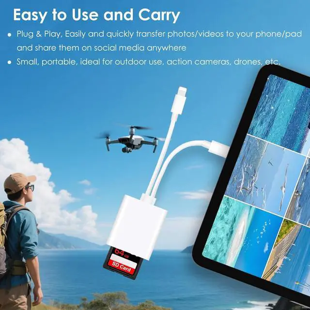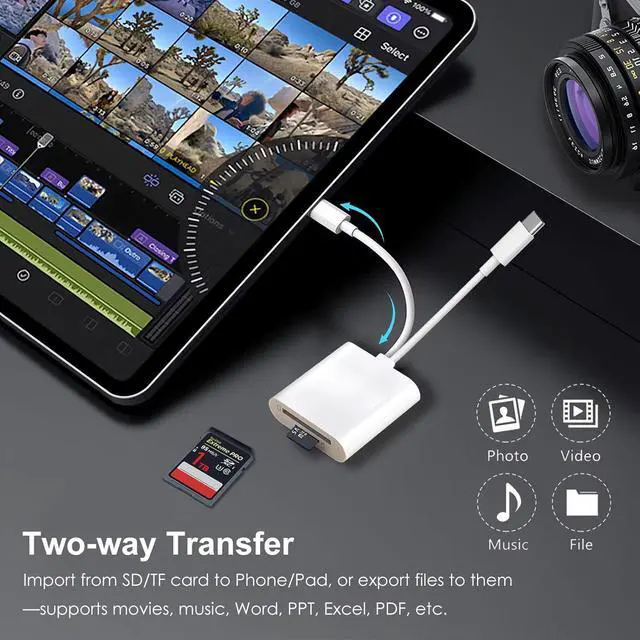 Universal Format CompatibilityOur SD and micro SD card adapter for iphone offers extensive support for standard photo formats like JPEG and RAW as well as SD/HD video formats such as h. 264 and MPEG-4. It designed for iPad features a lightweight and compact build making it effortless for you to tote around and adding a touch of convenience to your daily life. Instant-Use ConvenienceSay goodbye to the hassle of installing additional drivers. Simply insert the card reader into your Type C or lighting device and it springs into action right away. Compatible with iOS iPad OS Mac OS Android Chrome OS Windows and Linux operating systems it offers seamless usability across multiple platforms.