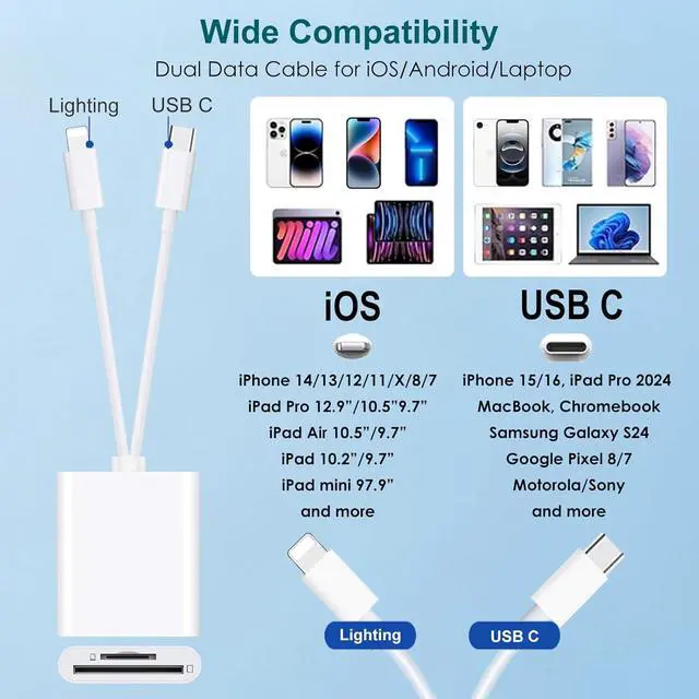 Dual SD & MicroSD Card SlotsOur innovative 2-in-1 sd card reader designed for both iPhone and USB C enabled gadgets features a unique SD/Micro SD (TF) dual slot layout. It supports an impressive storage capacity of up to 2 TB allowing you to effortlessly view files or securely backup and archive photos and videos. Works in harmony with a wide range of memory cards including SD SDHC SDXC Micro SD TF micro SDHC and micro SDXC and etc. Versatile FunctionsOur SD card reader USB C equipped with dual interfaces enabling seamless connectivity not only with lighting devices but also with USB C ports.