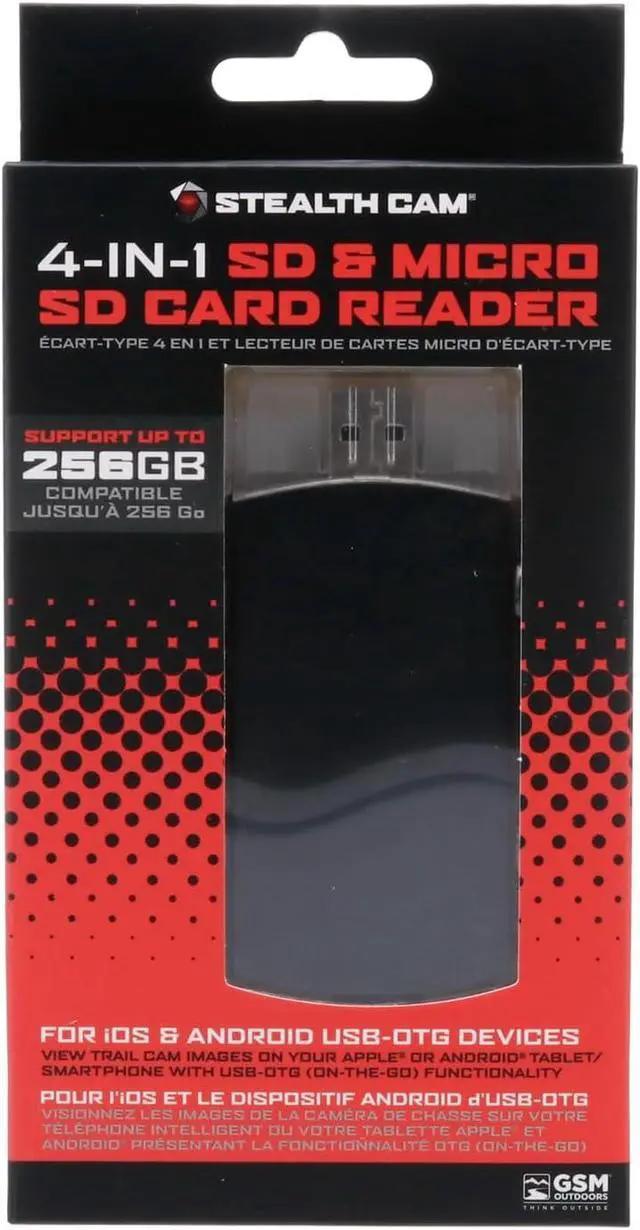 100% PLASTICImportedCOMPATIBILITY - Elevate your game camera experience with this 4-in-1 Memory Card Reader a versatile solution compatible with both iOS and Android devices with USB-OTG (on-the-go) functionality; Embrace a seamless connection across various platformsVERSATILE VIEWING - View your game hunting camera images effortlessly on or Android smartphones & tablets using iBrary Link for iOS and OTG for Android devices; Immerse yourself in the world of ease & convenience using this Stealth Cam Card ReaderCONNECTION OPTIONS - This reader features an array of connection interfaces including micro USB Lightning USB-C & USB 2.0; Compatibility across a spectrum of devices such as PCs Macs & tablets allows you to easily view your trail camera picturesCARD SUPPORT - The 4-in-1 reader caters to both SD and microSD memory card types accommodating storage capacities up to 256GB; This reader adapts to your unique storage requirements making it a must-have companion for every outdoor adventureUSER-FRIENDLY - Streamline your trail camera checks on the go with this pocket-sized SD memory card reader; Effortlessly transfer photos & videos from your hunting & scouting adventures with this SD reader ensuring a hassle-free experience in the field