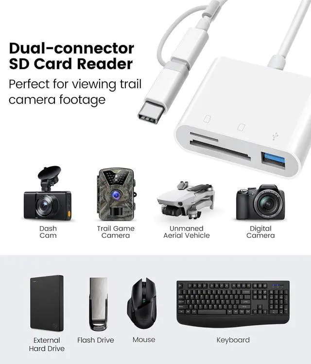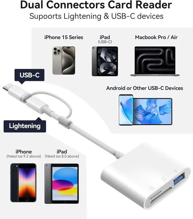 Dual-Connector: The inclusion of both a Lightening cord card reader and a USB-C to lightening adaptor ensuring compatibility with almost all your gadgets from iPhone 5 - 14 to your USB-C iPhone 15 iPad Macbook Mac Laptop or Android Devices.