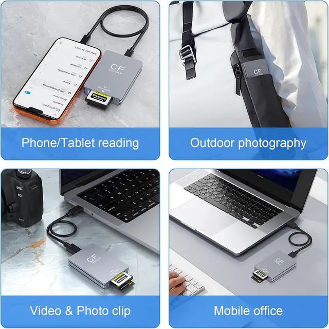 (Note: both cards cannot read simultaneously)Specially Designed for CFexpress Type B CardThis card reader is specially designed for the CFexpress (Type B) memory card. Provide great convenience for those who love photography or videography and use CFexpress card. SD Card CompatibilityNot only compatible with CFexpress Type B Card but also work with SD SDXC SDHC UHS-I Cards for your convenience. Plug & play hot-swapping capability easy and convenient to carry and use for photographer and videographer. Board CompatibilityCompatible with most systems such as Windows XP/Vista/7/8/ 8.1 /10/11 Mac OS Linux Chrome OS Android. Also this CFexpress card reader is compatible with most devices--not only USB type C device but also USB A device. What You Will Get1 x CFexpress Type B & SD 3.0 Card Reader 1 x USB-C TO C Cable 1 x USB-C TO A Cable 1 x User Manual 1-year and friendly customer service. Please feel free to contact us at any time.