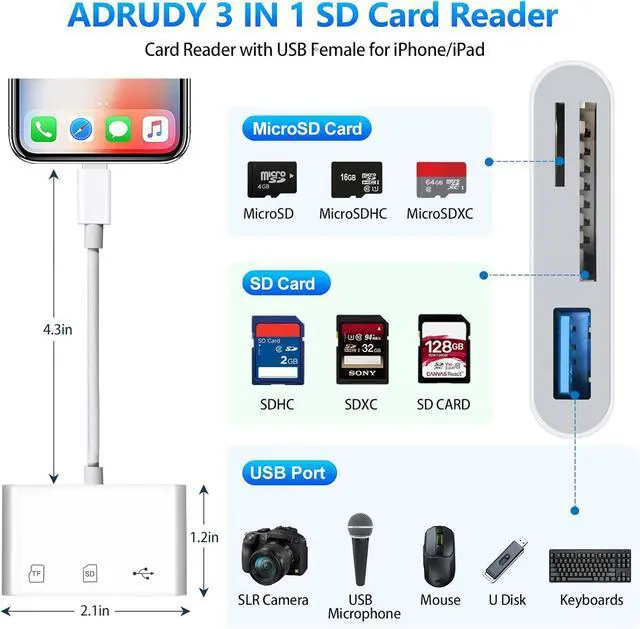 DUAL CARD SLOT DESIGN: This ADRUDY SD Card Reader for iPhone supports SD Card and MicroSD Card. Reading either full size SD SDXC and SDHC cards MicroSD MicroSDXC and MicroSDHC cards. Makes this memory card reader more practical valuable and versatile.