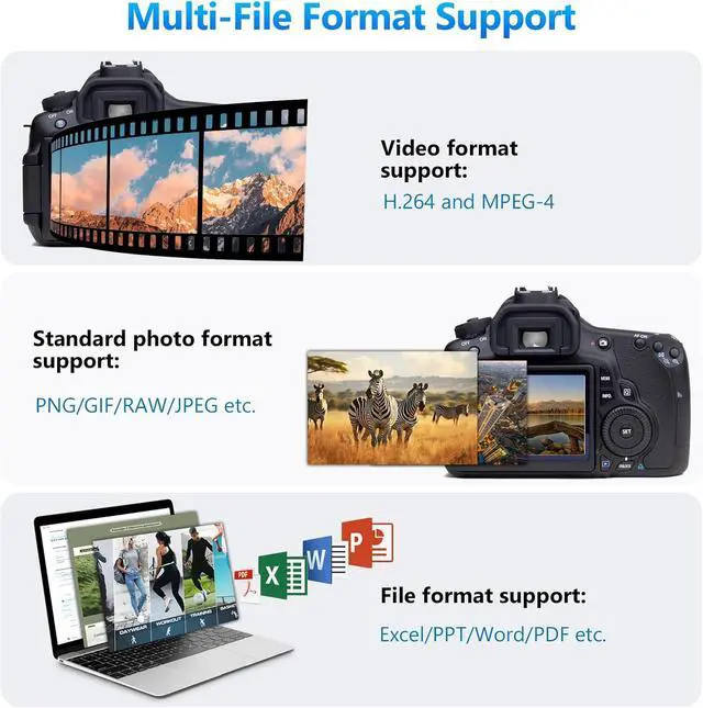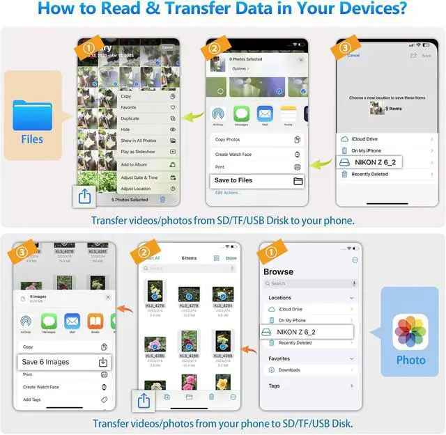 TWO-WAY TRANSFER: The ADRUDY SD Card Reader supports two-way transfer apply to IOS 13 and higher operating systems device. Export the file from iPhone/iPad to SD/TF card or import data from SD/TF card to iPhone/iPad. Plug and play suitable for a variety file types including videos(formats including H. 264 and MPEG-4) photos (standard photo formats included JPEG PNG GIF) music documents (Word Power point Excel PDF) etc.