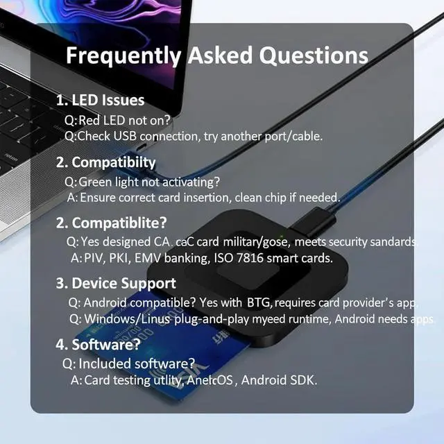CAC USB Smart Card ReaderDOD Military CAC USB Smart Card Reader for Government ID National ID ActivClient AKO OWA DKO JKO NKO BOL GKO Marinenet AF Portal Pure Edge Viewer ApproveIt DCO DTS LPS Disa Enterprise Email etc. Broad System CompatibilityChip Card Reader works with virtually all contact chip cards and PC operating systems Windows 10 Windows 8/ 8.1 (32/64 bit) Windows 7 (also 64bit) Windows Vista (also 64bit) Windows XP / 2000 (also 64bit) Windows 98 / ME Windows Server 2008/2012/2016 Server Windows CE 5.0 / CE. NET Linux/Unix (also 64bit) MacOS X (All). Plug and PlayEasy setup without any driver or installation process simply plug the reader into an available USB port on your computer or laptop.