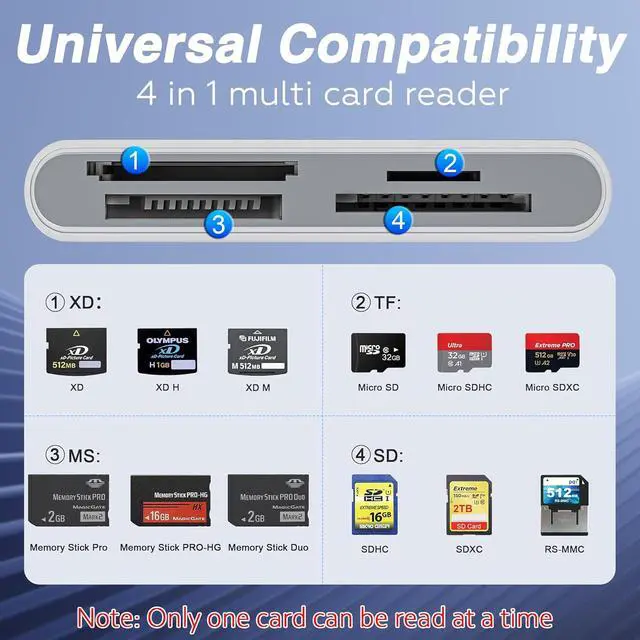 Two-Way Transfer: The multi-card reader is plug-and-play with no software installation required. It allows you to import photos/videos from SD/MS/XD/TF cards to iOS/Android devices and also export files from your phone/tablet to memory cards for backup or sharing. Broad Device &