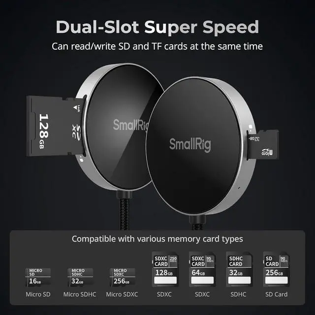 Dual-Slot Super Speed - Simultaneously read/write SD & TF cards at 104MB/s (USB 3.0 ) transferring 1GB files in 10s 4× faster than standard readersMagnetic Phone Partner - Built-in strong magnet instantly attaches for iPhone 16/15 S24 Mate 60 backs for hands-free operationSpace-Saving 90° Design - 90° elbow interface stable plugging and unplugging simpler wiring can prevent cable clutter and the safety plug will not disconnect during transmissionCompatibility -