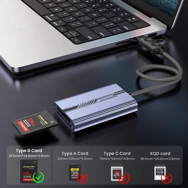 This particular CFexpress card reader is designed to be compatible with CFexpress Type B memory cards. However it should be noted that it is not compatible with CFexpress Type A/C and XQD cards. Plug & PlayCFexpress Type B Card Reader allow the cable adapter does not require additional drivers and software. What You Get1*MOGOOD Gbps CFexpress Type B Card Reader.