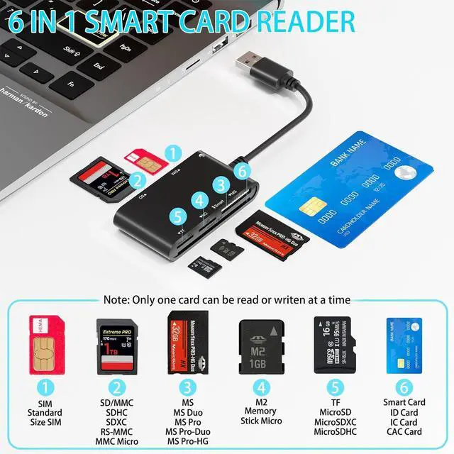 Note: Only one card can be read or written at a timeEasy to UseThis TF/SD/MMC/MS/M2 Card reader requires no drivers and is plug-and-play compatible with Microsoft Windows XP or later and Mac OS 10.6. 2 or later and Linux Fedora FC8 or later systems. The 7 in 1 smart card reader is suitable for use with platforms and applications such as ActivClient AKO OWA DKO JKO NKO BOL GKO and more. Driver Instructions for Smart/SimThis smart/sim card reader is compatible with Microsoft Windows XP or later and Linux Fedora FC8 or later. We provide card reader driver and SIM card editable software but we cannot provide smart card driver and editable software such as bank card/ID card. If you need to read them you need to ask the smart card provider how to download install and use them.