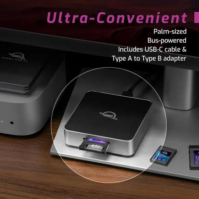 Maximum Performance: Ingest at up to 5000MB/s speed. Over 3300MB/s real world performance when tested with an OWC Atlas Ultra memory cardNon-skid rubber feet keep reader in place while OWC ClingOn secures the included USB-C connecting cable; Fanless thermally efficient design keeps reading cards at top speed; Confirm use status instantly via integrated LED2 Year OWC Limited Warranty; Includes Innergize health performance and field upgrade management tool when using
