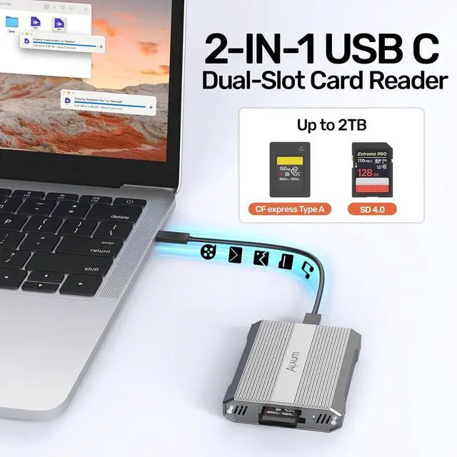 Universal Compatibility: This CFexpress Type A and SD UHS-II dual slot card reader is compatible with most operating systems such as Windows/Mac OS//iOS/Linux/Android. Supports maximum capacity of CFexpress card up to 2TB. 2-in-1 high-speed memory card reader designed for professionals.