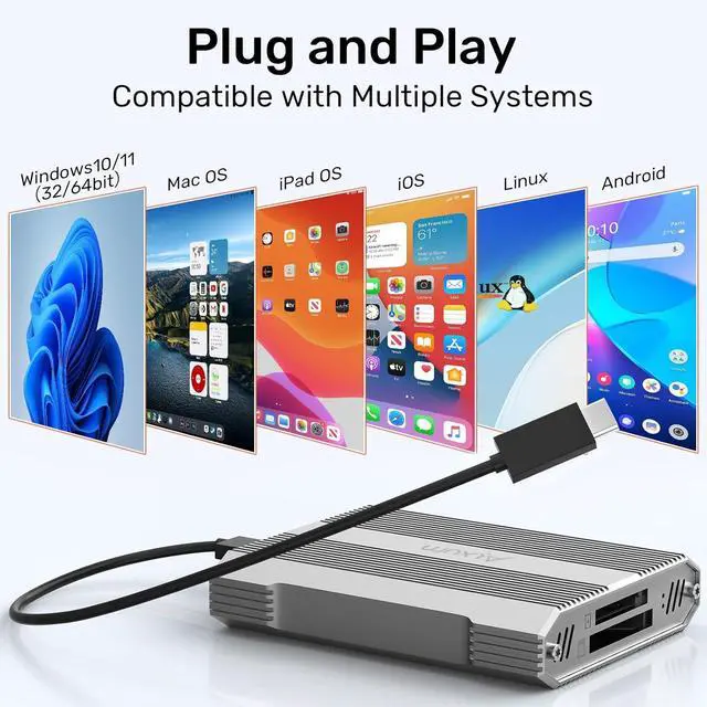 Play: No drivers or complicated installation required. This CF Express Type A card reader features a plug-and-play design for instant connection and data transfer. The LED lights up solid when a card is inserted and flashes during reading or writing. It's the ideal choice for professionals looking to significantly enhance their word processing capabilities. Compact and PortableThis dual-slot card reader for CFexpress Type A and SD cards features an aluminum alloy casing and an ultra-slim design making it easy to carry on vacations and business trips making photography a pleasure. The aluminum housing is more conducive to heat dissipation ensuring the best performance of the card reader.