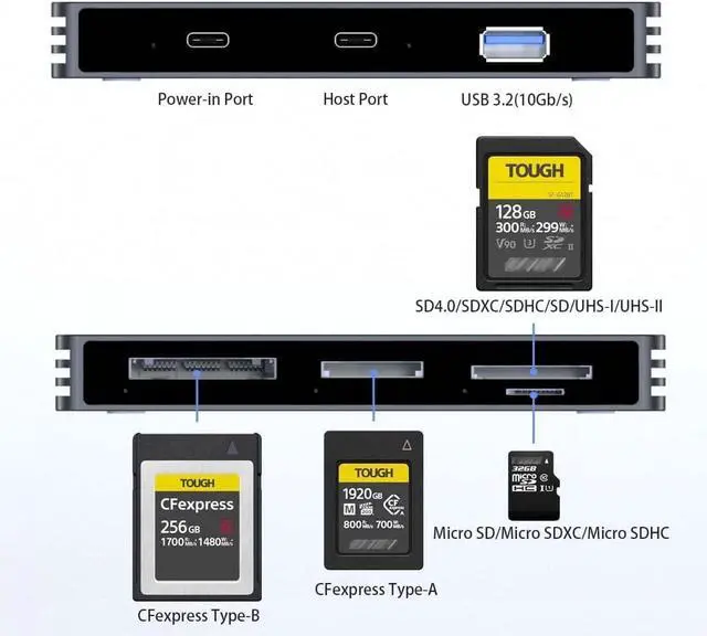 The Ultimate All-in-One Media Hub - Designed for professional photographers and content creators this 6-in-1 reader eliminates the need for multiple dongles. It simultaneously supports CFexpress Type B (for Nikon/Canon) CFexpress Type A (for Sony) SDXC UHS-II and microSD cards. Its a versatile bus-powered plug-and-play solution that streamlines your entire post-production workflow. Blazing-Fast 10Gbps Data Transfer - Harness the full potential of USB 3.2 Gen 2 technology. Transfer high-bitrate 8K video and RAW photos efficiently with speeds up to 950MB/s for CFexpress Type A & B cards and 312MB/s for SD/microSD UHS-II cards. Say goodbye to long wait times and bottlenecked transfers.