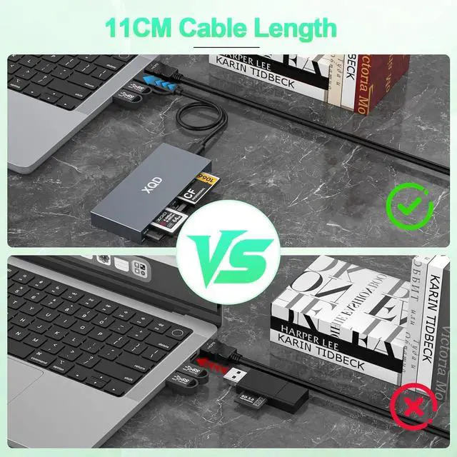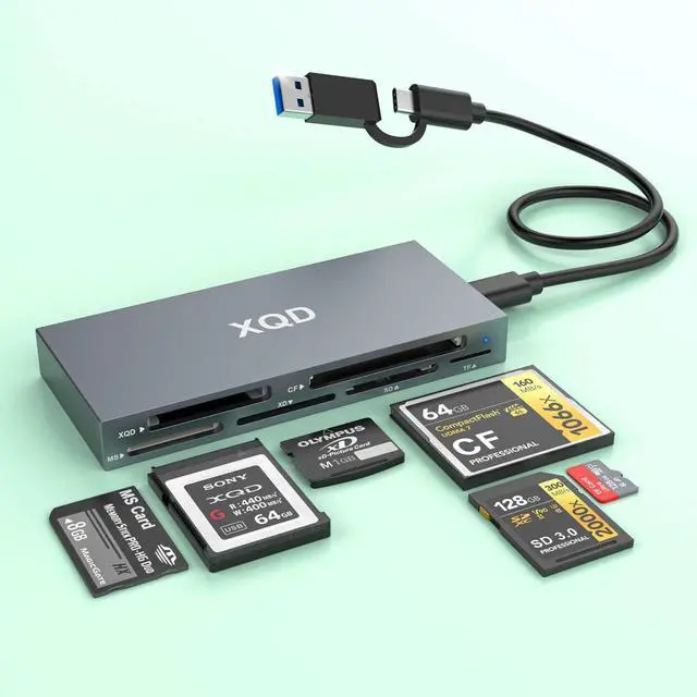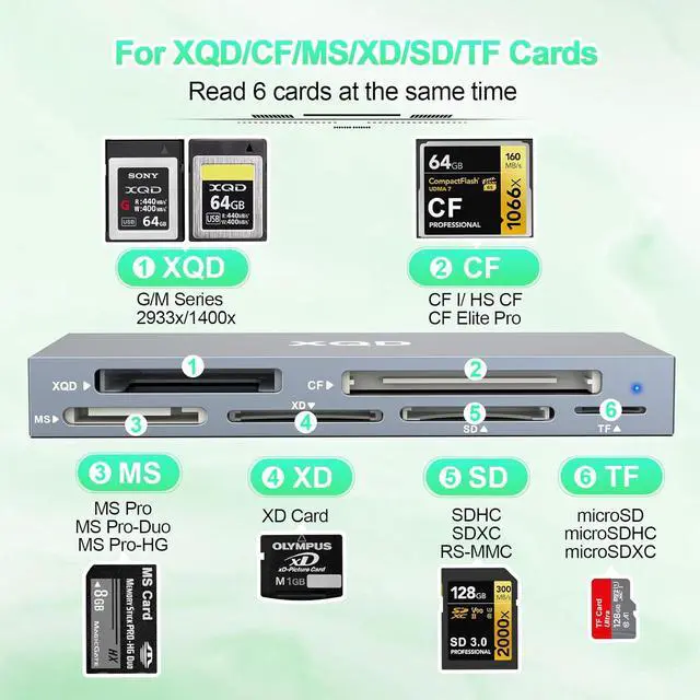 6-in-2 XQD Card ReaderThis multifunctional card reader is equipped with 1* XQD 1*SD 1*TF 1*CF 1*MS 1*XD card slots which is the perfect card reader for photography enthusiasts to realize the data reading and transfer. Considering various functional requirements 10Gbps USB card reader can read up to 6 cards at the same time eliminating the need for multiple switching transfers or multi-device adapters for multi-card transfers which is a great convenience for those who enjoy photography and use XQD cards for storageWidely CompatibilityMultiple card reader can read XQD (Sony G-series and M-series card Lexar 2933x Lexar1400x Mark cards) SD (SD SDXC SDHC RS-MMC) TF (microSD microSDXC microSDHC) CF (CF I HS CF CF Elite Pro) MS and XD cards and supports reading SD cards up to 2TB in capacity.