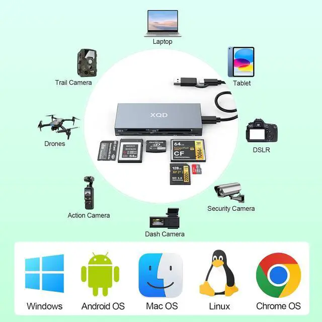 The USB 3.2 Gen 2 Multi card reader is compatible with Mac/Chrome OS/Linux/Android/Windows XP/Vista/7/8/ 8.1 /10/11. No driver requiredSuper Speed 10GbpsThe latest USB 3.2 (USB 3.2 Gen2) technology supports up to 10Gbps data transfer for memory cards(backward compatible with USB 3.1 Gen 1). This Sony XQD card reader allows you to transfer movies music photos documents and more faster. You can also easily monitor the connection status of the multi memory card reader through the LED indicatorPlug & Play Easy to UseNo need APP. This 8 in 1 memory card reader is very easy to use simple plug and play functionality no app required no network required no power required.
