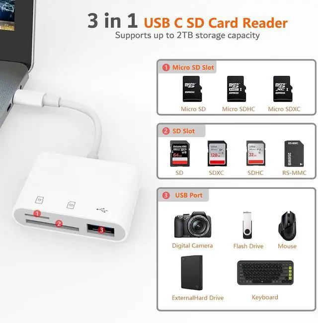 USB-A Port for More ConnectivityThe SD card adapter is also designed with a USB A female port which can flexible connect USB peripheral device directly such as USB Flash drivers cameras hard disks game controllers mouse keyboard and more. The SD or Micro SD card can be recognized simultaneously with USB peripheral. But the SD card and Micro SD card cannot be reading simultaneously. Experience blazing-fast two-way transfers This micro sd card reader support transfer files/photos/music/video from SD/ Micro SD card to iPhone/iPad/Mac or your other usbc device in seconds enables bi-directional transfer and helps free up storage space.