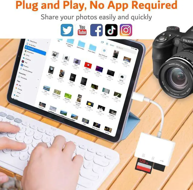 3-in-1 USB C SD Card ReaderThis versatile SD card reader supports SD card Micro SD card (TF) and USB-A devices making it the perfect content creator essentials for photographers and videographers. With over-current and short-circuit protection safety is ensured for your important files. Dual-Slot Memory Card ReaderThe digital camera adapter adopts dual card slot design compatible with SD/SDHC/SDXC/RS-MMC/MicroSD/MicroSDXC/MicroSDHC memory cards. It is a essential photography accessories for Kodak PixPro FZ55/ FZ45 Canon Nikon Sony Digital Camera. No apps No drivers plug and play you only need to use the iOS built-in Files app to import and export photos and videos.
