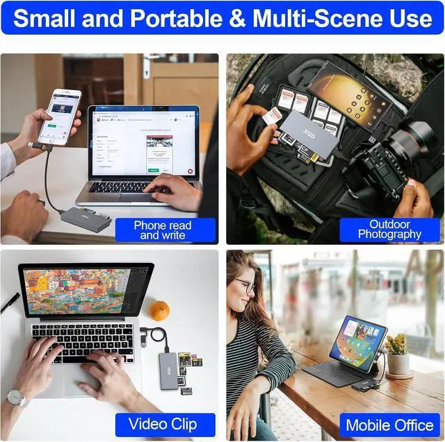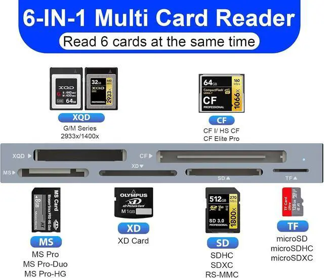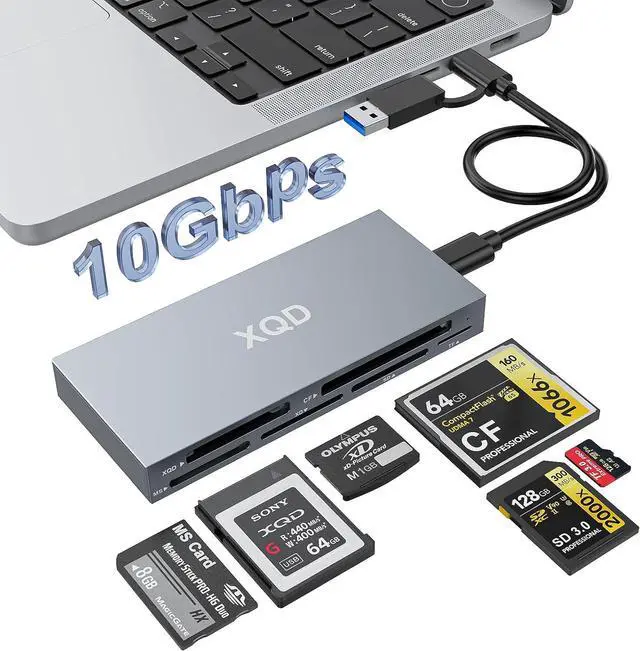 6-in-1 Multi-Format Card Reader Designed for creators using multiple camera systems this reader supports XQD CF SD TF (MicroSD) MS and XD cards. Perfect for quickly accessing files from Nikon Fujifilm Fujifilm and other professional cameras. Ultra-Fast 10Gbps Transfers Equipped with a USB-C 3.2 Gen 2 interface the reader delivers up to 10Gbps host bandwidth for rapid offloading of RAW photos 4K/8K videos and large media libraries saving you valuable workflow time. Efficient Workflow Plug-and-Play Supports multiple card types without driver installation. Simply plug in and start transferring on Windows macOS or Linux. Ideal for photographers videographers and content creators who need reliable performance on any setup.