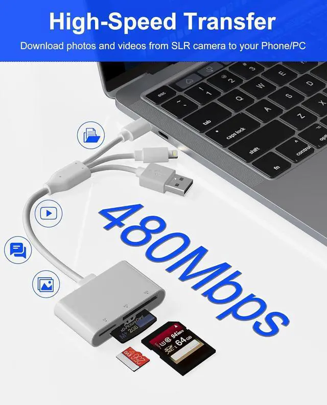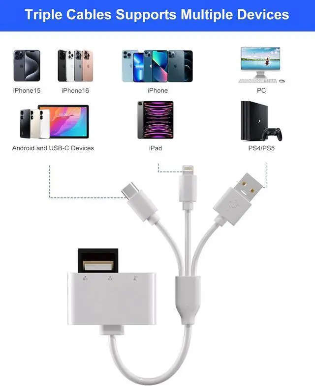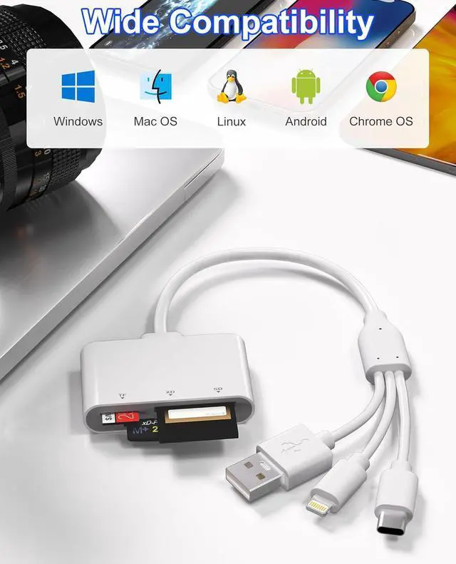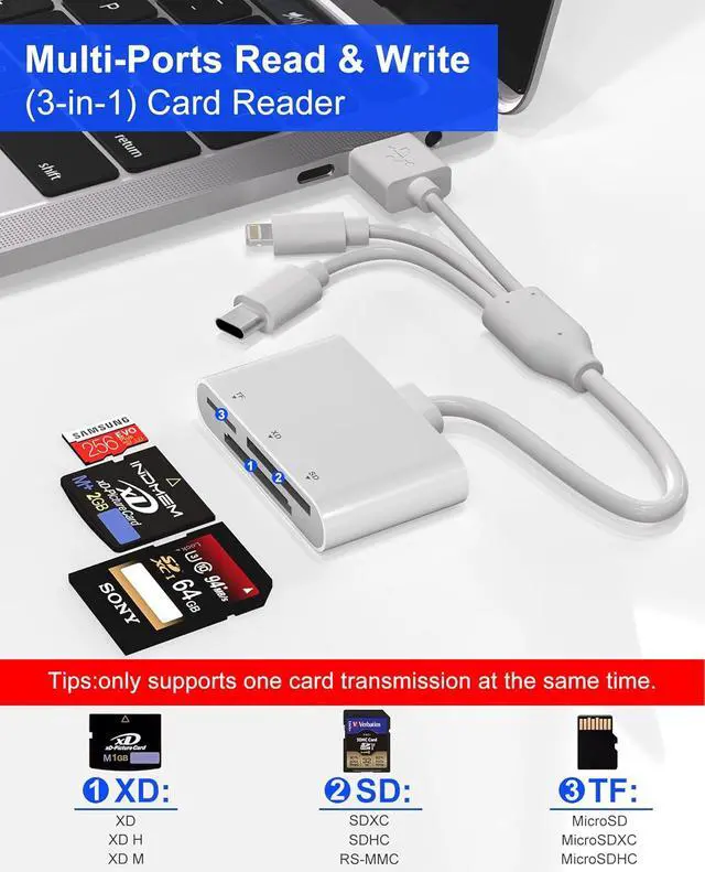 Instant Access: Experience lightning-speed file transfers with our XD card reader delivering up to 480Mbps performance for photos and videos. This XD picture card reader supports JPEG/RAW formats and HD videos (H. 264/MPEG-4) with exFAT compatibility (NTFS not supported). Transfer content from your Olympus XD Card or Fujifilm XD card to your iPhone in secondsno apps required for seamless plug-and-play operation. Triple Interface & Triple Slot Universal Compatibility: Maximize versatility with three connectivity options: Lightning for iPhone USB-C for MacBook/Android and USB-A for PC/laptops. This 3-in-1 XD card adapter features dedicated slots for XD-Picture Card SD/SDHC/SDXC and MicroSD/TF cards. Perfectly compatible with iOS devices (iPhone 16/15/14) iPad Android phones MacBooks and Windows PCs. Bidirectional Data Transfer for