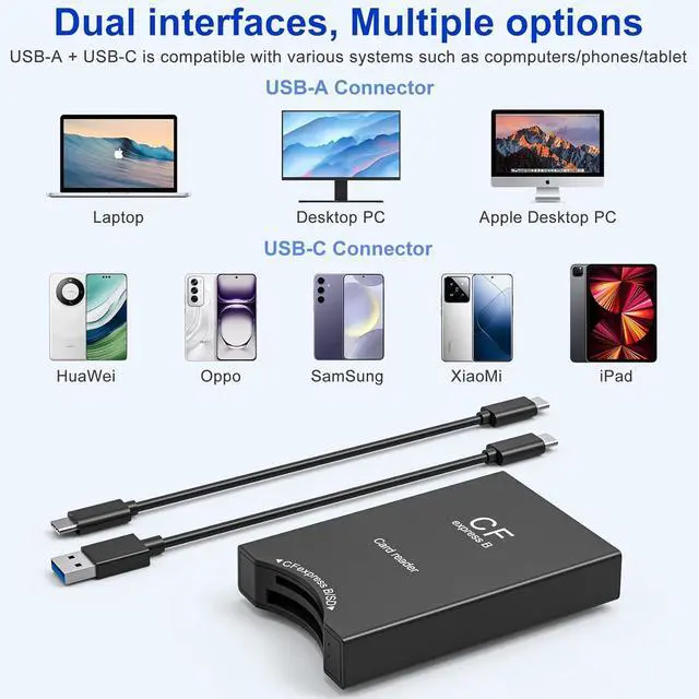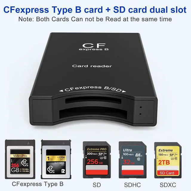 It is widely compatible with iPhone 15 16 series Macbook Google and other brands of smartphones tablets laptops cameras camcorders and other USB C port devices as well as traditional USB A computer devices. Strong Compatibility - Cfexpress Type b and sd card reader is strongly compatible with CFexpress type B (SanDisk/Sony/ProGrade/Lexar /TOPSSD CFexpress Type B series) and SD card (SD SDXC SDHC RS-MMC) supporting the maximum capacity of CFexpress card up to 2TB. The maximum capacity of CFexpress card is up to 2TB; if both CFexpress card and SD card are inserted at the same time CFexpress card will be read by default; after inserting CFexpress card SD card will be disconnected automatically.