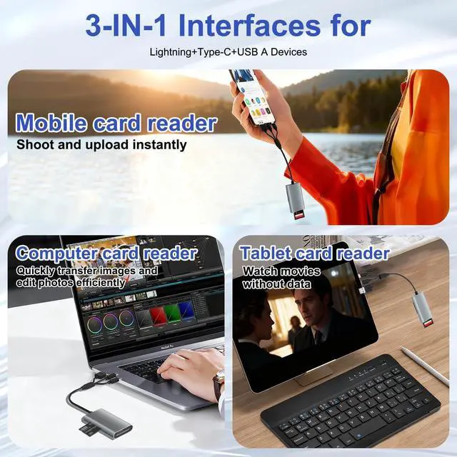 Multi-Interface Design: Equipped with USB-A USB-C and Lightning ports it easily connects to various devices such as phones tablets and laptops without the need for additional adapters. Whether you're outdoors in the office or at home photos videos and documents can be read and processed efficiently anytime anywhereHigh-Speed??