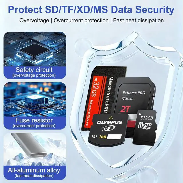 Capacity: Compatible with multiple mainstream memory card types such as SD TF (microSD) MS and XD supporting up to 2TB of read capacity. Whether it's high-resolution photographs or high-definition video footage it can load easily and transfer stably without lagTriple Security Protection for