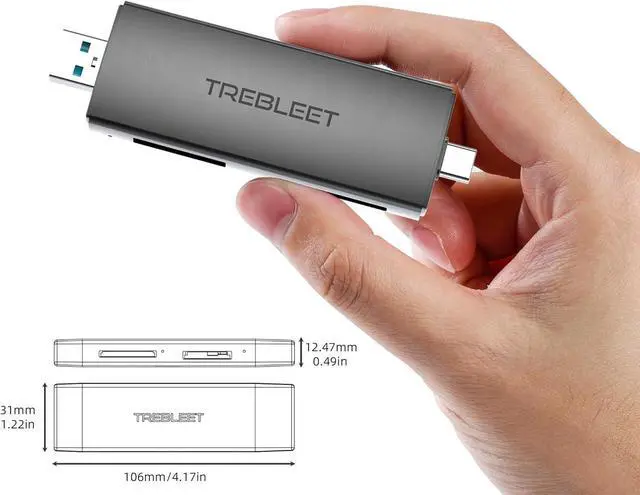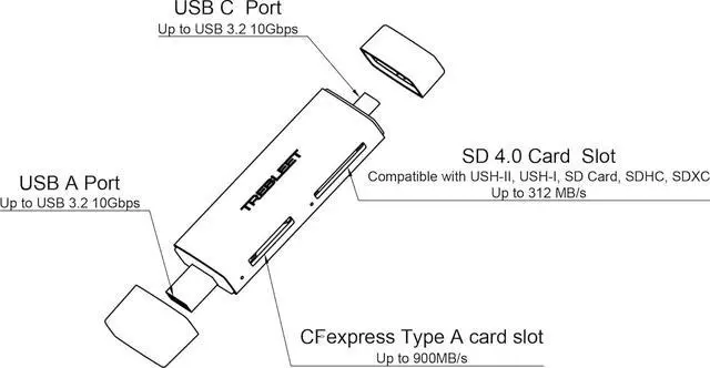 [USB 3.2 10Gb + USB-C & USB-A] The TREBLEET CFexpress Type-A Card Reader features the USB 3.2 10Gbps high-speed performance of up to 900MB/s with CFexpress Type-A allowing you to transfer files between your PC and USB-C devices anywhere anytime. Backward compatible with USB 3.1 Gen 1 and USB 3.0 up to 5Gbps. [Plug and Play OTG Adapter] No software needed. Designed with a push-to-play CFE slot simply press in to insert your memory card and push to retrieve for added convenience. [Compatible Multi OS] Windows 7/ 8/ 8.1 / 10/ 11/ Linux/ MAC OS/Android With OTG[Compatibility Camera Models] Compatible with Sony Alpha 1 (ILCE-1) Sony Alpha 9 III Sony Alpha 7R V (ILCE-7RM5) Sony Alpha 7S III Sony Alpha 7 IV (ILCE-7M4) Sony Cinema Line FX30 Sony ILME-FX30B Cinema Line and other CFexpress Type A Card models on the market.