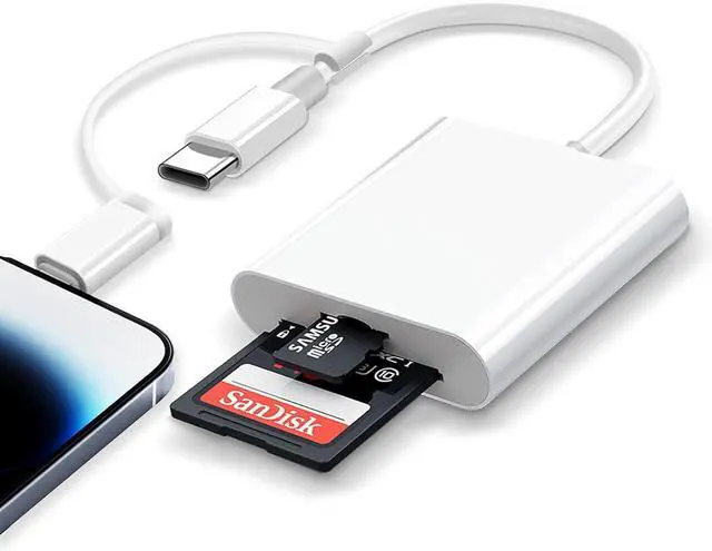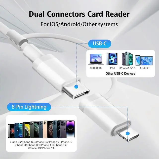 Wide Compatibility- The Micro SD card reader works with devices such as smartphones and laptops equipped with USB-C or lightning ports. Compatible with iPhone 16/15/14/13/12/11/8/7/6/Plus/Pro/Pro Max/XR/X/XS/iPad/mini/Air Galaxy S10 S9 Note 9 8/LG G5 G6 V20 and other devices. For iOS iPad OS Mac OS Android Chrome OS Windows and Linux. Import data from SD/TF card to iPhone/iPad or export the file from iPhone/iPad to SD/TF card. Include Photos Videos and documents etc. Dual Connector Dual Slot Design- The sd card reader for iphone is equipped with a Type C connector and an iPhone connector compatible with devices equipped with USB C ports or lightning port.