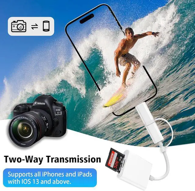 High-Speed Data Transfer- The sd to iphone adapter can efficiently transfer photos or videos from your camera memory card to your device at a speed of about 30MB. The SD card viewer supports two-way transfer from device to SD/TF card and from SD/TF card to device.
