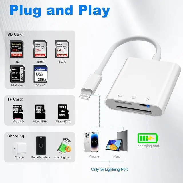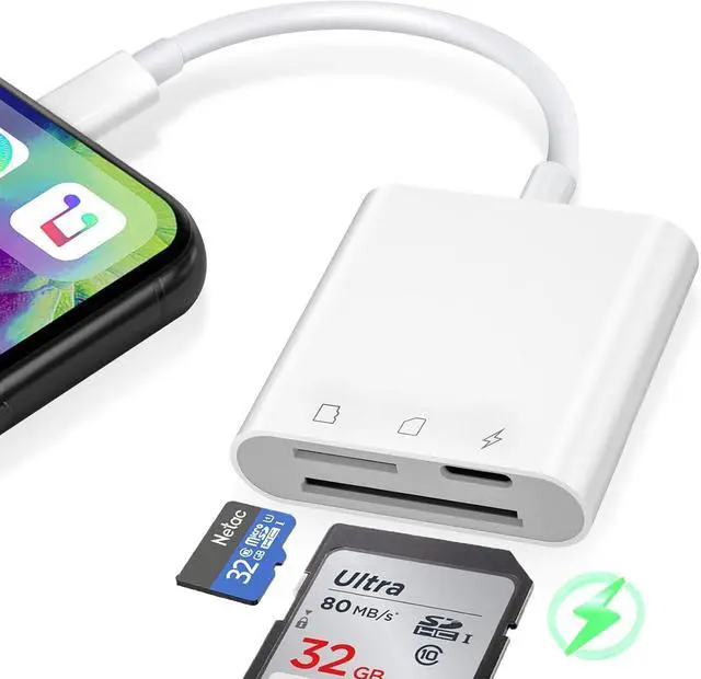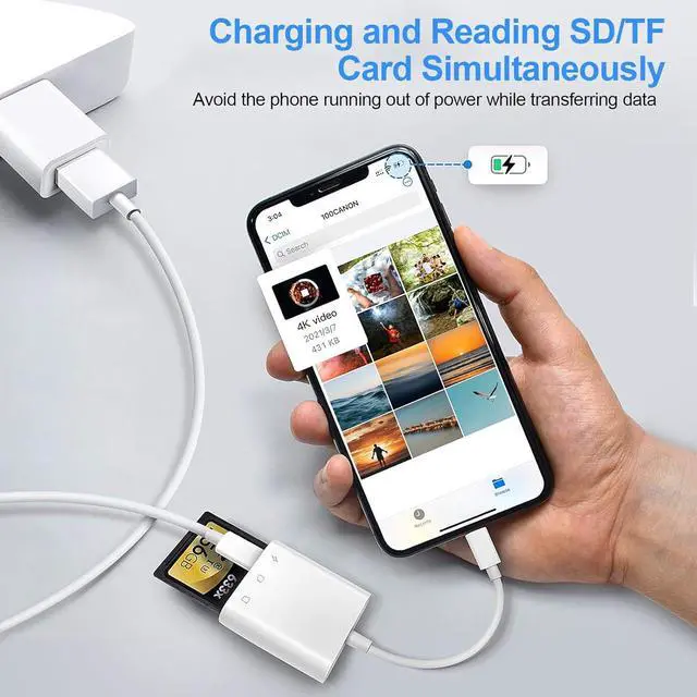 Adapter with Charging: Digital Camera SD card reader for iPhone supports simultaneous card reading & charging This prevents the phone from running out of power while in use.