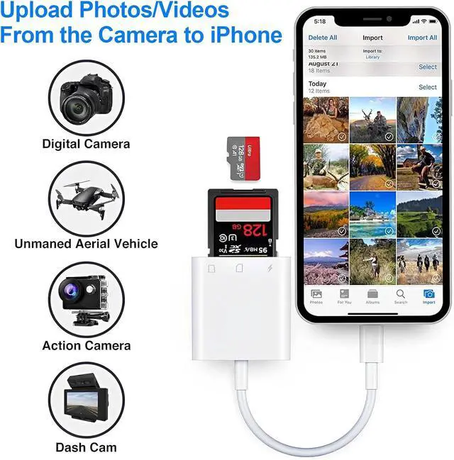 Play: This SD card reader for iPhone is easily to use no APP no network no driver no extra power. You can transfer photos from camera SD card to your phone anytime and share your moments with friends at the first time; SD Card