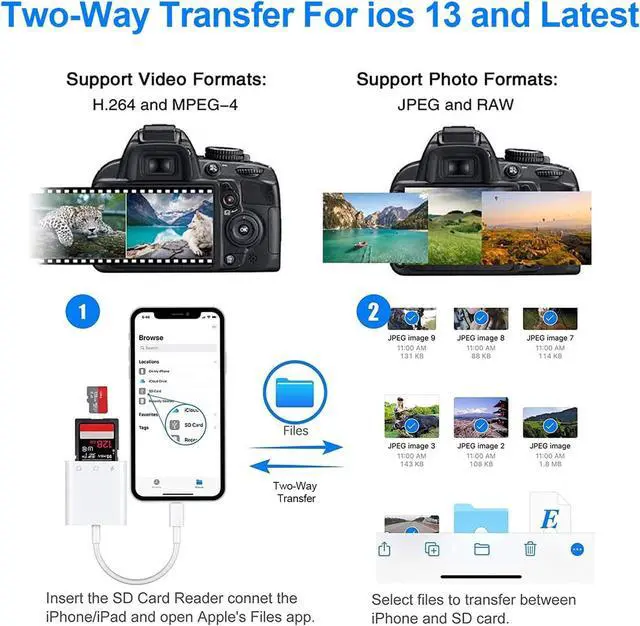 Bidirectional Transfer: The Micro SD/SD Memory Card Reader for iPhone supports two-way to stable transfer files/photos/music/video from SD card to phone/pad or form phone/pad to memory cards. (The SD card adapter for iphone supports iOS 13 and laterCapacity