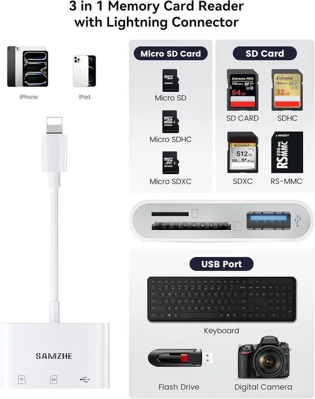 The iPhone SD card reader designed for iPhone between 5 to 14(Not for iPhone 15&16) iPad Mac to conveniently provide data OTG functionality. It compatible with iPhone 14/14 Plus/14 Pro/14 Pro Max/13/13 mini /13 Pro/ 13 Pro Max / 12/12 mini/12 Pro/12 Pro Max /11/11 Pro/XS/XS Max/XR/ X/8/8 Plus / 7/7 Plus / 6s / 6s Plus / 6/6 Plus / SE /SE2 and iPad Air / Mini / Pro with Lightning Port etc. Plug and PlayThe SAMZHE memory card reader for iPhone iPad no drivers or special setup are required no network no caching and directly recognizes the memory cards for selecting photos videos to import vis iOS's Photos system.